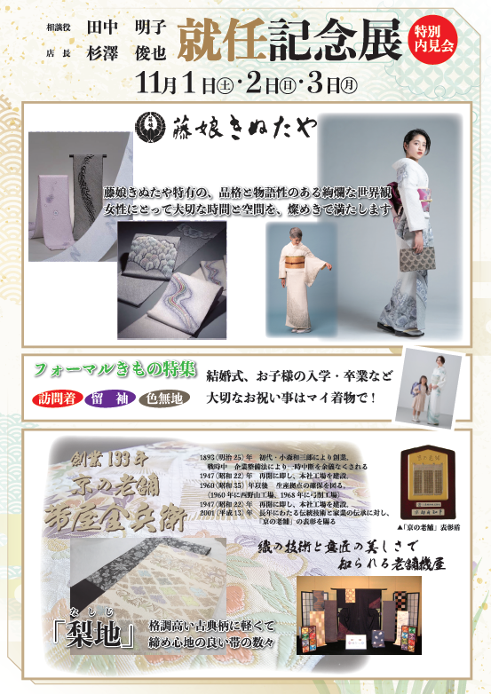 絞り染めのトップブランド「藤娘きぬたや」。今回の催しでは小紋からフォーマル着物まで幅広く展示致します。ちょっとしたお出かけからお祝いの席まで、人生を彩る藤娘きぬたやの着物。一つ一つ手作業で絞るその繊細な技術を、ぜひ実際に手に取って体感下さいませ。