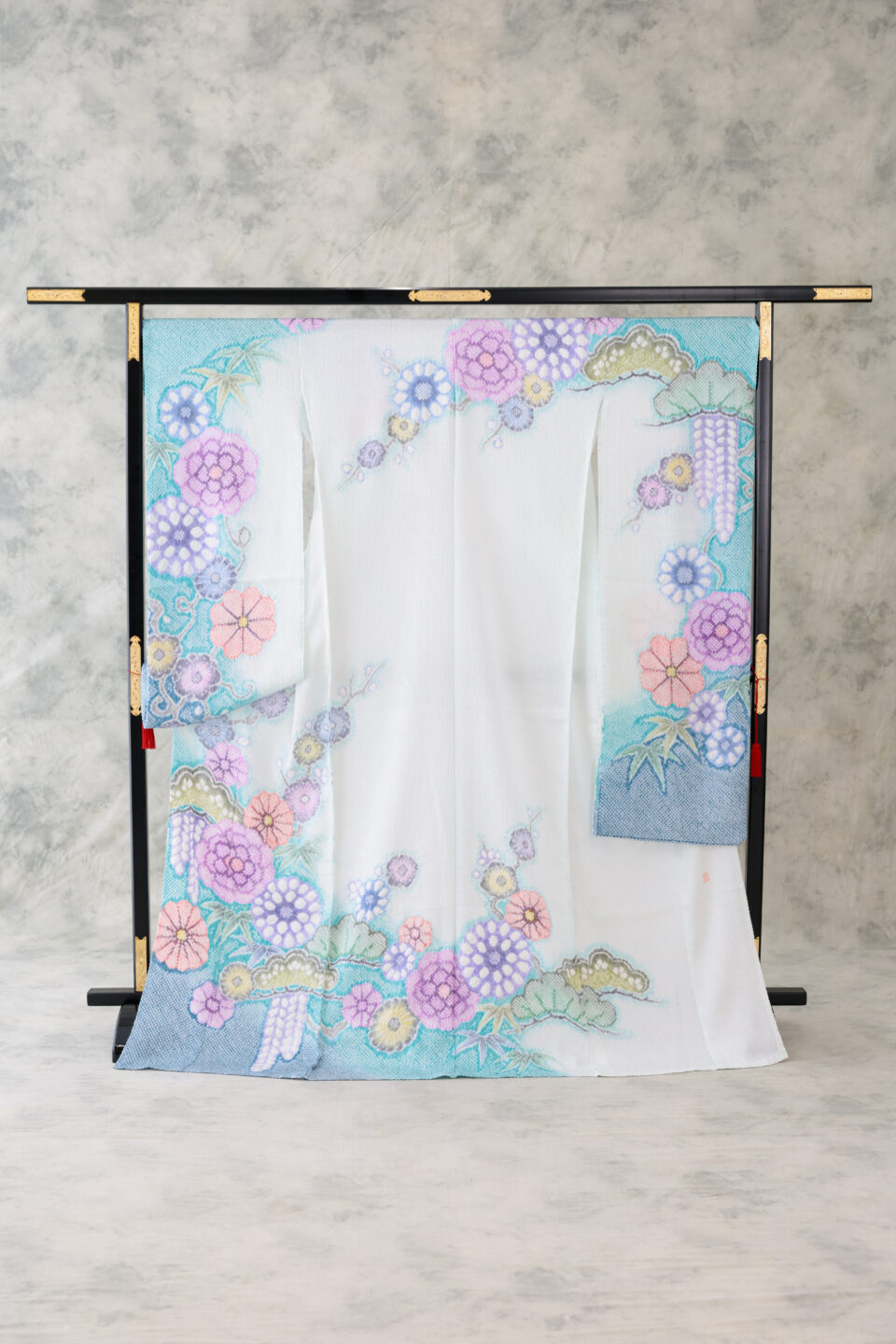 【藤娘きぬたや】総絞り振袖 白・青・ミントグリーン