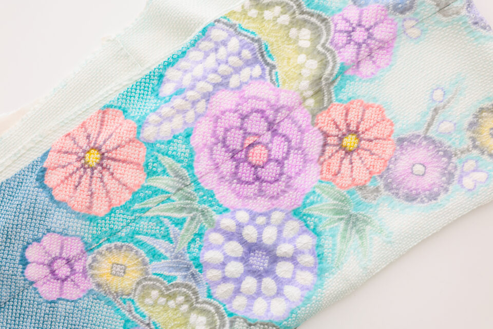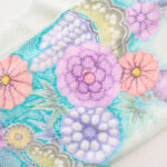 総絞りの振袖に藤娘きぬたやが誇る染色技法『手挿し』を、最も柔らかい地色に施すことで、優しさが際立ち着る方の周りも安心するような配色になっております。
