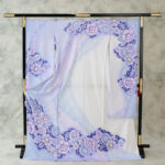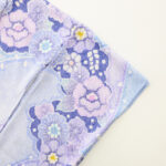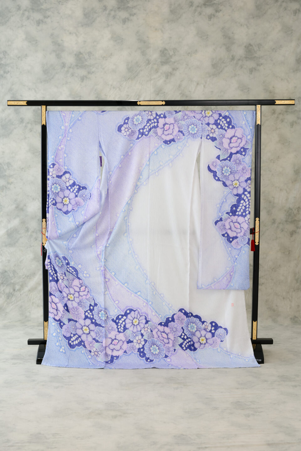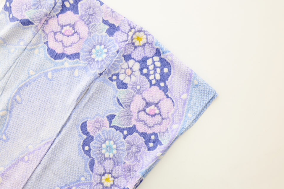 淡いブルーやパープルのグラデショーンをベースに、深いブルーの雲取りに咲く花々が鮮やかに染められております。