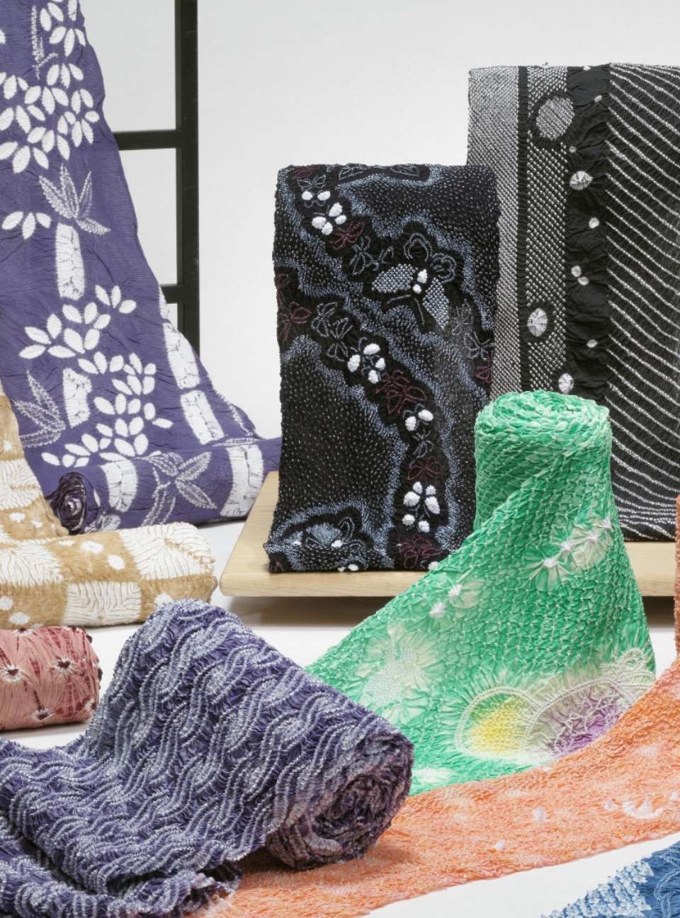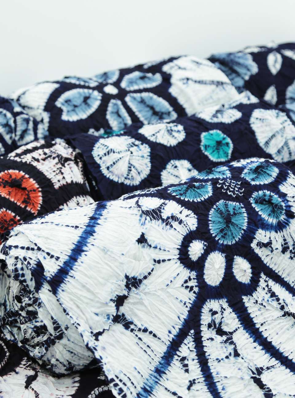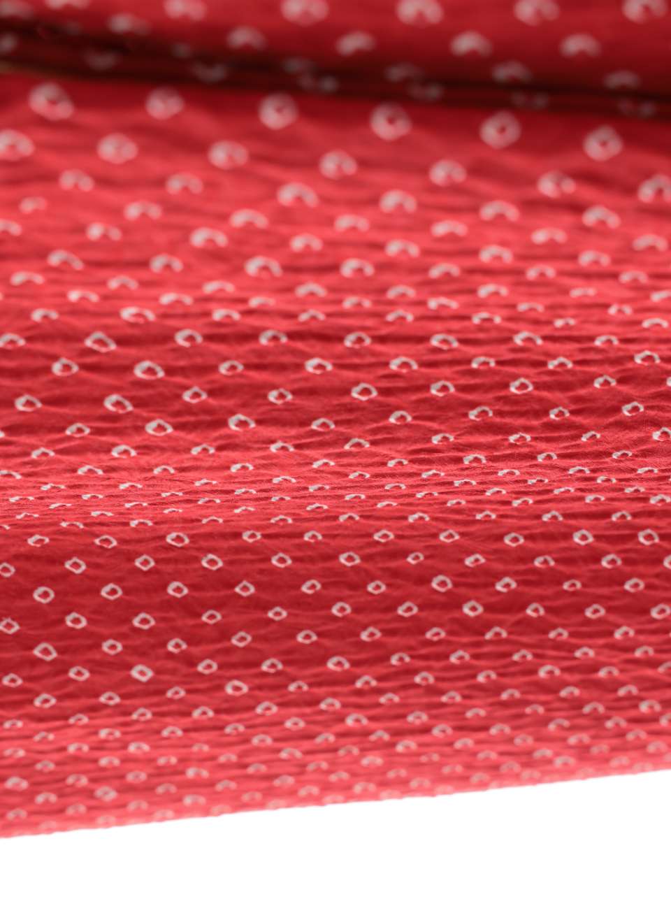 括った部分は、染色のときに色が染まらず白く残るため、それが絞りの模様となります。 また、色染めのあとに生地を括った糸をほどくと「括り粒」という立体的な凹凸が残り、これが「絞り」独特の風合いを作ります。