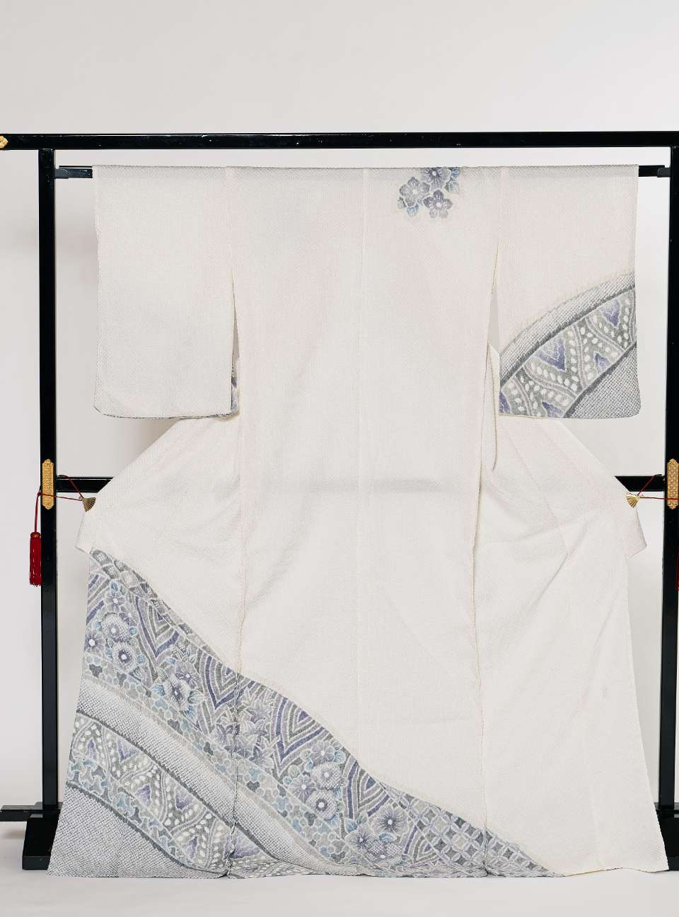 振袖の染色は基本的に1点ごとに変えていますが、こちらは淡いブルーやパープルのグラデショーンをベースに、深いブルーの雲取りに咲く花々を鮮やかに染めました。